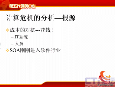 我們分析這個根源,根源其實(shí)就是錢的問題,昨天我聽了遠(yuǎn)傳的Bill的講座,講得非常精彩,而且非常幽默,他在整個講的過程中,不斷地提一個次,提了30多次,說是“很花錢”呀,“太花錢”了,“很花錢”。確實(shí)是很花錢,呼叫中心是一個燒錢的中心,這是他的理論,其實(shí)我的想法也是一樣的。那么對于IT系統(tǒng)來說,確實(shí)需要花很多錢,現(xiàn)在的系統(tǒng)大家想想系統(tǒng)要么和CRM對接,要么和ERP對接,有的和供應(yīng)鏈對接,有的和人力資源管理對接,有的和業(yè)務(wù)核心系統(tǒng)對接。那么人員上也是很花錢的,對于外包呼叫中心來說,客戶服務(wù)200座席左右的,人工的成本占到了75%,這個成本是非常高的,確實(shí)是很花錢。那么剛才也說了,剛才那些需求,短信的需求,大家看雖然很復(fù)雜,如果給我一千萬的話,我能輕松地把它搞定,給我一年的時間,但這是不現(xiàn)實(shí)的。解決的辦法有嗎?有,SOA。SOA是現(xiàn)在軟件行業(yè)一直在做的一件事情,是公認(rèn)的標(biāo)準(zhǔn),但是它剛剛進(jìn)入中國,而且還都沒有進(jìn)入呼叫中心。