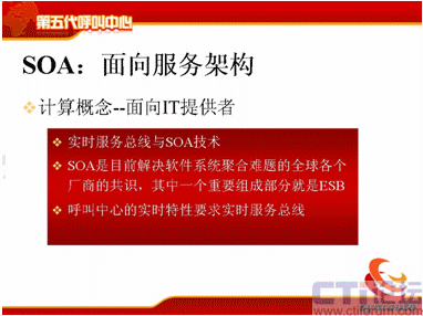 SOA就是面向服務(wù)的架構(gòu),這個概念近兩、三年來在中國的發(fā)展是比較快的,計算的概念,它是面向IT提供者。實(shí)時服務(wù)總線技術(shù)與SOA,SOA是目前解決軟件系統(tǒng)聚合難題的全球各個廠商的共識,其中一個重要的概念是ESB,不知道大家清楚嗎?就是企業(yè)服務(wù)總線,是SOA里面重要的組成部分,呼叫中心的實(shí)時特性要求,這個服務(wù)總線不是普通的服務(wù)總線,而是實(shí)時的服務(wù)總線。