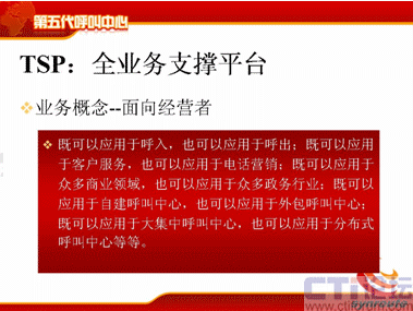 TSP這個概念其實(shí)比較清晰,比較簡單,它的意思就說對于呼叫中心來說,它能支持各種業(yè)務(wù),既可以支持呼入,也可以支持呼出;既可以應(yīng)用于客戶服務(wù),也可以應(yīng)用于電話營銷;既可以應(yīng)用于商業(yè)領(lǐng)域,也可以應(yīng)用于政務(wù)領(lǐng)域;既可以用于自建,也可以用于外包;可以是大規(guī)模集中的,也可以是分布式的。
