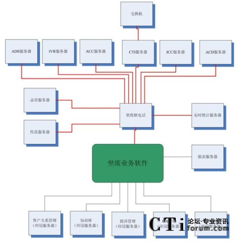 很多集成商或業(yè)務(wù)軟件開(kāi)發(fā)商認(rèn)為這種結(jié)構(gòu)過(guò)于復(fù)雜,而他們自身往往提供“整體解決方案”,即所有的服務(wù)器軟件基本上都是自己的,根據(jù)客戶的要求修改即可。例如,客戶關(guān)系管理、知識(shí)庫(kù)、投訴管理、OA、訂單管理以及坐席軟電話、ADS服務(wù)器、IVR服務(wù)器、ACC服務(wù)器、ICC服務(wù)器、ACD服務(wù)器、錄音服務(wù)器、傳真服務(wù)器、報(bào)表服務(wù)器、實(shí)時(shí)統(tǒng)計(jì)服務(wù)器都是自己來(lái)做,那么對(duì)于很多接口環(huán)節(jié)都可以節(jié)省了。