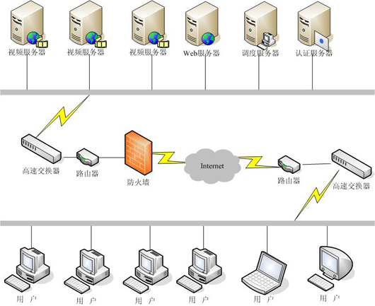 考慮到在線點(diǎn)播的用戶為1000并發(fā),所以使用一臺(tái)服務(wù)器就可以滿足需求了,客戶可以通過(guò)認(rèn)證后,經(jīng)客戶經(jīng)過(guò)調(diào)度服務(wù)器將請(qǐng)求反饋給視頻服務(wù)器,完成視頻點(diǎn)播流程,具體架構(gòu)如圖。