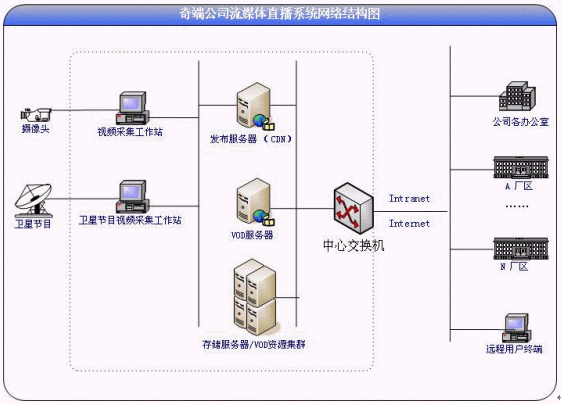 要在企業(yè)內(nèi)網(wǎng)與廣域網(wǎng)上對有線電視、衛(wèi)星電視及現(xiàn)場視頻進(jìn)行實時直播,這需要系統(tǒng)具備高兩種傳輸方式,內(nèi)網(wǎng)實現(xiàn)組播協(xié)議,互聯(lián)網(wǎng)實現(xiàn)單播協(xié)議。同時要求系統(tǒng)傳輸速率、數(shù)據(jù)同步、數(shù)據(jù)流的分流、高穩(wěn)定性等特性。而實現(xiàn)網(wǎng)絡(luò)的視、音頻傳輸最好的解決方案就是流式媒體的傳輸方式。
