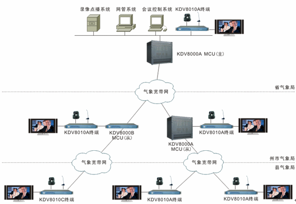 整個系統(tǒng)依托云南省氣象局自建的寬帶IP網(wǎng)絡(luò)進(jìn)行搭建。省氣象局與各州市氣象局的網(wǎng)絡(luò)連接可為視頻會議提供2M通信帶寬。各州市氣象局與各縣級氣象局的網(wǎng)絡(luò)連接可為視頻會議提供768K通信帶寬。整個系統(tǒng)采用MCU兩級級聯(lián)組網(wǎng)。