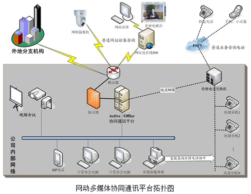 在上圖所示的Active Office客戶應(yīng)用圖中,網(wǎng)動協(xié)同通訊平臺承擔(dān)了統(tǒng)一通信中心樞紐的作用,將語音、視頻、數(shù)據(jù)完美結(jié)合,使IP網(wǎng)絡(luò)與電話網(wǎng)絡(luò)、本地網(wǎng)絡(luò)與遠程網(wǎng)絡(luò)互聯(lián)互通,在同一個平臺上交互協(xié)同。