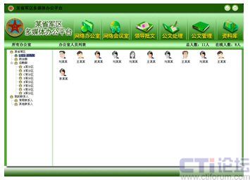 如圖所示的畫面即為網(wǎng)動協(xié)同辦公系統(tǒng)的基礎工具——協(xié)同通訊系統(tǒng),該系統(tǒng)可將部隊機構(gòu)內(nèi)的所有部門、人員按照實際的組織結(jié)構(gòu)列出,應用該系統(tǒng)的人員通過點擊其他在線人員,從而有選擇性的與對方進行語音、視頻、數(shù)據(jù)共享、點對點會議等各種操作,將以往“看不見”的對話變?yōu)椤懊鎸γ妗钡慕涣。相比于傳統(tǒng)的電話溝通而言,它不僅更暢通快捷,更可以最大化的降低溝通成本。另外,數(shù)據(jù)共享功能還可以將軍隊里需共同探討的話題,如作戰(zhàn)地圖動態(tài)研究、工作報告資料等實時顯示在數(shù)據(jù)區(qū)中,雙方通過電腦即可進行遠程的話題討論、圈點批注。