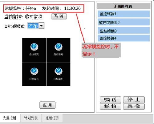 監(jiān)控計(jì)劃規(guī)定了監(jiān)控系統(tǒng)何時(shí)以何種方式在大屏上顯示多個(gè)現(xiàn)場(chǎng)的監(jiān)控畫面。監(jiān)控畫面可輪詢,可調(diào)整設(shè)置畫面分屏顯示模式;可以固定在某位置顯示某監(jiān)控畫面;可以切換到險(xiǎn)情聯(lián)動(dòng)監(jiān)控模式。可以與監(jiān)控畫面喊話;監(jiān)控錄像;保存畫面等功能。