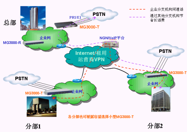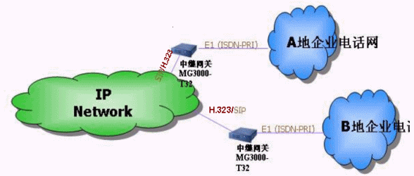 •   對于企業(yè)VoIP網(wǎng)絡(luò)建設(shè),通過MG3000-T利用PRI接口來連接具有PBX的辦公地點(diǎn),利用FXO口網(wǎng)關(guān)來連接員工不多的辦公地點(diǎn),對于沒有PBX的辦公地點(diǎn)也可以使用IPPBX接入,從而實(shí)現(xiàn)多分支機(jī)構(gòu)之間的VoIP互聯(lián)。