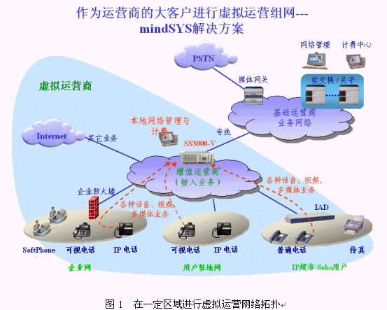 對于希望投資低啟動快的虛擬運營商,我們設計了mindSYS解決方案。在mindSYS解決方案中,以SS3000-V作為核心的呼叫控制、業(yè)務管理和計費平臺,配合中繼網(wǎng)關MG3000-T以及眾多的接入終端,組成一個完整的解決方案。該方案可以滿足虛擬運營商的初期業(yè)務發(fā)展,有強大的組網(wǎng)適應性和良好的管理計費功能,并具備極好的可擴展性,可以根據(jù)用戶的業(yè)務發(fā)展,平滑升級到更強大的增值業(yè)務、運營管理計費平臺--OpenSP-K平臺,無縫過渡到完善的大規(guī)模虛擬運營解決方案。