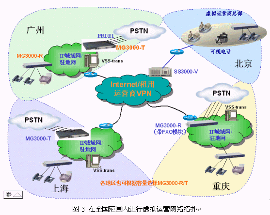 對于想在全國范圍內(nèi)運營的虛擬運營商,在總部放置一套SS3000-V,同時在有用戶群的區(qū)域的用戶網(wǎng)內(nèi)放置VSS-trans,以解決公網(wǎng)-私網(wǎng)及私網(wǎng)-私網(wǎng)之間的NAT/PAT穿越。為了解決長途問題,在各地放置MG3000-T實現(xiàn)長途落地。為了保證語音質(zhì)量,通常虛擬運營商通過自己的IP網(wǎng)或租用VPN等,沒有相關資源時也可以通過Internet將各地聯(lián)系起來,通過在各分部放置FXO口IAD或MG3000-T可以實現(xiàn)長途零話費,利用各地網(wǎng)關相互落地,從而實現(xiàn)撥叫其他區(qū)域的外網(wǎng)用戶只需付市話費。這樣就為虛擬運營提供了很好的競爭基礎,開拓了廣闊的利潤空間。