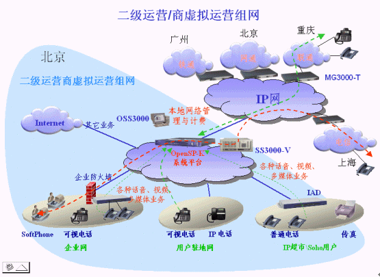 在這里,SS3000-V作為虛擬運營商自己的呼叫控制、業(yè)務管理和計費平臺,適合于在某一區(qū)域有很好客戶資源的虛擬運營商快速實現(xiàn)業(yè)務推廣。中繼媒體網(wǎng)關設備由基礎電信運營商提供。由于SS3000-V有很好的管理、計費特性,使得虛擬運營商可以輕松地參與運營,獲得業(yè)務收益。