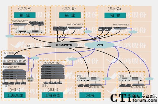 4. 上海接入采用電信30B+D線路兩條。使用2E1的MG3000-T4設(shè)備接入。上海南區(qū)IP分機(jī)600門,北區(qū)IP分機(jī)300門,全部采用MG3000-R32(32FXS)設(shè)備做接入。福建龍巖A、B、C,江西高安,河南鄭州這5個分支分別采用16FXO口網(wǎng)關(guān)與PBX或電信虛擬網(wǎng)直線互聯(lián)。