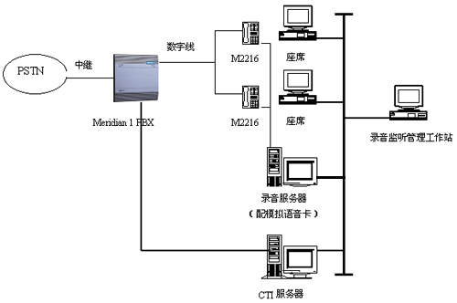 使用Meridian 2216 ACD數(shù)字話機(jī)上的錄音端口,直接接入模擬語(yǔ)音卡,進(jìn)行錄音監(jiān)控。其物理結(jié)構(gòu)如下所示: