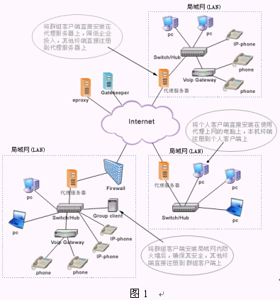 該系統(tǒng)建立在NGN基礎(chǔ)上,包括交換中心Asiasoft Gatekeeper,解決NAT、防火墻的代理軟件eProxy和視頻多點(diǎn)控制單元MCU,這些都建立在ITU制定的標(biāo)準(zhǔn)H.323協(xié)議上。一般單位和企業(yè)為便于管理和應(yīng)用,都建設(shè)了使用私有IP 地址的局域網(wǎng)(LAN),當(dāng)需要訪問(wèn)外網(wǎng)時(shí)必須進(jìn)行地址轉(zhuǎn)換(NAT)。局域網(wǎng)內(nèi)的終端之間進(jìn)行呼叫和通信時(shí)沒(méi)有任何問(wèn)題,但與外網(wǎng)終端進(jìn)行VoIP通信時(shí)就會(huì)有問(wèn)題產(chǎn)生,原因是局域網(wǎng)中的IP地址是私有的,在Internet中不可路由。為了解決VoIP通信協(xié)議不能穿越防火墻和NAT的問(wèn)題,亞軟軟件技術(shù)股份有限公司推出了eProxy代理軟件。它可以在確保網(wǎng)絡(luò)安全、不改變已有設(shè)備和網(wǎng)絡(luò)環(huán)境的情況下,為用戶實(shí)現(xiàn)實(shí)時(shí)的點(diǎn)對(duì)點(diǎn)IP語(yǔ)音、視頻和數(shù)據(jù)通信服務(wù)。(如圖1所示)