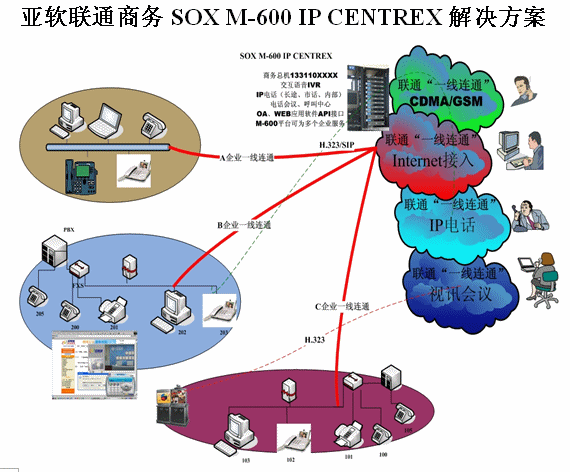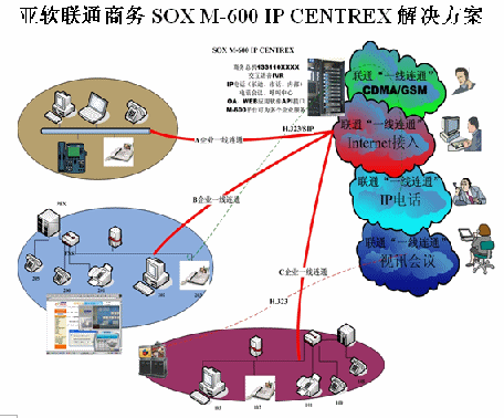 亞軟SOX融合通信解決方案也叫聯(lián)通商務(wù)解決方案,該方案是基于軟交換的可為多個(gè)集團(tuán)用戶(hù)提供IP語(yǔ)音解決方案。SOX融合通信解決方案為集群用戶(hù)提供了區(qū)別于傳統(tǒng)集團(tuán)內(nèi)部、外部的通信方式,集團(tuán)無(wú)需再購(gòu)置PBX及為其支付維護(hù)費(fèi)用。由于SOX融合通信解決方案是置于IDC托管中心并基于IP軟交換技術(shù),所以沒(méi)有地域限制,具有集群性、可移動(dòng)性等IP通信特征。
