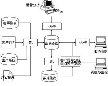數(shù)據(jù)主要有四個(gè)方面的來(lái)源:客戶信息、客戶行為、生產(chǎn)系統(tǒng)和其它相關(guān)數(shù)據(jù)。這些數(shù)據(jù)通過(guò)抽取、轉(zhuǎn)換和裝載過(guò)程,形成數(shù)據(jù)倉(cāng)庫(kù),并通過(guò)OLAP和報(bào)表,將客戶的整體行為分析和企業(yè)運(yùn)營(yíng)分析等傳遞給數(shù)據(jù)倉(cāng)庫(kù)用戶。