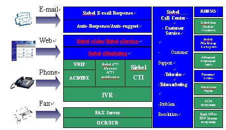 電子商務(wù)網(wǎng)站的運(yùn)作和企業(yè)網(wǎng)站的建設(shè),為其帶來了更多的市場商機(jī),嶄新的客戶接觸的機(jī)會。客戶在一秒鐘內(nèi)就能決定是選擇你還是別人,可以說未來網(wǎng)戰(zhàn)、傳統(tǒng)企業(yè)的競爭就是客戶關(guān)系的競爭;網(wǎng)站要生存,企業(yè)要發(fā)展,關(guān)鍵要在發(fā)展客戶關(guān)系上下功夫。如何涉足CRM領(lǐng)域,如何盡快地利用CRM先進(jìn)的客戶關(guān)系管理理念,是擺在網(wǎng)站和傳統(tǒng)企業(yè)面前的一個棘手問題。以基于Siebel .COM應(yīng)用為涉足CRM的切入點(diǎn),使企業(yè)能夠更好地實(shí)施電子商務(wù)計(jì)劃,積極發(fā)展基于Web的客戶關(guān)系管理,最終使網(wǎng)站和企業(yè)真正成為接觸客戶、了解客戶、服務(wù)于客戶的商務(wù)平臺,繼而不斷向完整的企業(yè)級CRM目標(biāo)邁進(jìn)。圖七展示出完整的基于Siebel .COM的CRM視圖。