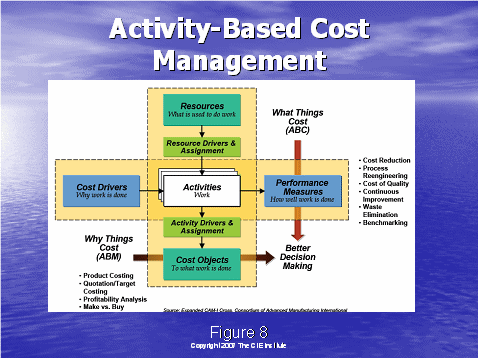 通過(guò)了解圖8,我們將以行動(dòng)成本管理大體是什么的總括作為結(jié)束。我們從左邊的成本驅(qū)動(dòng)因素開(kāi)始——這是做工作的原因,例如:獲得客戶,維持客戶。就如圖4中所說(shuō)的,這些成本驅(qū)動(dòng)因素可以細(xì)分到工作行動(dòng)上去?梢酝ㄟ^(guò)描述人,培訓(xùn),設(shè)備和技術(shù)資源來(lái)組成工作行動(dòng)。資源驅(qū)動(dòng)因素被用于分配這些企業(yè)成本到各個(gè)行動(dòng)上去。下一步就是系統(tǒng)地確定行動(dòng)驅(qū)動(dòng)因素,分配行動(dòng)成本到成本對(duì)象上去,這有利于決策的制定。例如,獲得一個(gè)客戶和維持一個(gè)客戶需要花費(fèi)多少的成本?