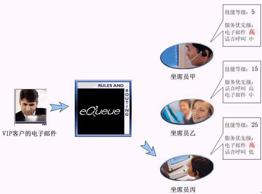 我們假設在某個聯(lián)絡中心里,有甲、乙、丙三位坐席員工作在同一個項目組(坐席組)。甲是新員工,只具有基本服務技能,經驗很有限;乙是一位擁有豐富經驗的坐席員,語音呼叫應答技巧非常嫻熟,具有回復電子郵件的技能但是熟練程度略低于語音應答技能;丙是一位經驗豐富、技能全面的坐席員,業(yè)務熟練,其最擅長的是回復客戶的電子郵件。假設有一位重要客戶發(fā)來電子郵件咨詢一個非常專業(yè)的技術問題。由于這是一位VIP客戶,服務條款中規(guī)定了他所有的呼叫請求都必須由經驗豐富的坐席員來響應。在eQueue多媒體單一隊列中,他的電子郵件被限定為坐席員的技能只有達到或超過等級15才有資格回復。在3個坐席員中,甲因為技能等級只有5,不能滿足回復郵件的先決條件,雖然擁有此項技能且優(yōu)先級為高,依然沒有資格響應這個聯(lián)絡請求;乙、丙的技能等級都滿足回復郵件的條件,但是丙的此項技能服務優(yōu)先級為高,因此,在丙坐席員處在可服務狀態(tài)下,eQueue會將此VIP客戶的電子郵件優(yōu)先派發(fā)給她。只有當她處于忙碌狀態(tài)時,才會派發(fā)給乙坐席員。