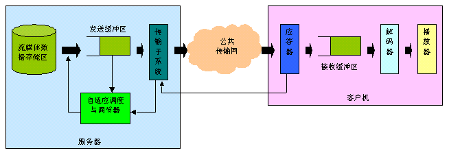 實(shí)時(shí)自適應(yīng)網(wǎng)絡(luò)帶寬的流媒體傳送技術(shù),是上海清鶴數(shù)碼科技公司的一項(xiàng)可大幅提高流媒體寬帶傳送過程中的關(guān)鍵服務(wù)質(zhì)量瓶頸的國際技術(shù)專利。我們知道,目前制約流媒體寬帶應(yīng)用發(fā)展的核心問題在于服務(wù)質(zhì)量。簡(jiǎn)單地說,由于因特網(wǎng)的狀況是不可靠的,其帶寬、負(fù)荷等變化劇烈,這難以滿足流媒體寬帶業(yè)務(wù)的實(shí)時(shí)性服務(wù)質(zhì)量要求,并常常造成播放卡殼、延遲、視頻質(zhì)量抖動(dòng)劇烈等不良情況,給使用者感官造成很大影響。所以解決好流媒體寬帶應(yīng)用的服務(wù)質(zhì)量問題對(duì)于流媒體寬帶應(yīng)用是極為重要的。如圖1所示,在一般的流媒體寬帶系統(tǒng)里,視頻服務(wù)器通過網(wǎng)絡(luò)向客戶機(jī)實(shí)時(shí)傳送流媒體信息。