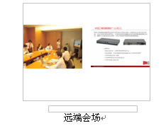 對(duì)于很多分會(huì)場(chǎng)通常只有1臺(tái)顯示設(shè)備的情況,H3C公司的視訊終端提供在1臺(tái)顯示設(shè)備上同時(shí)顯示"遠(yuǎn)端的會(huì)場(chǎng)圖像+遠(yuǎn)端膠片+本地會(huì)場(chǎng)圖像",顯示模式可通過(guò)終端遙控器靈活選擇:遠(yuǎn)端圖像、遠(yuǎn)端膠片、遠(yuǎn)端圖像+遠(yuǎn)端膠片、,實(shí)際顯示效果如下圖所示: