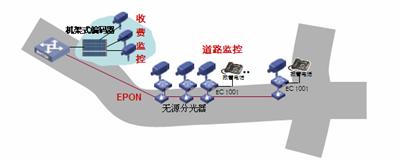 道路沿線監(jiān)控:采用EPON組網(wǎng),路況監(jiān)控球機接入前端編碼器,多個編碼器通過一根EPON光纖接入到中心交換機上,布線方便節(jié)省光纖資源。編碼器內(nèi)置交換機功能可以接入IP報警電話方便公路報警。還可以將支持IP接口的可變信號板和氣象站直接接入編碼器交換機端口,實現(xiàn)一網(wǎng)多用,降低整體網(wǎng)絡成本。