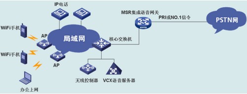 MSR設備集成語音網關功能,結合WX3024無線交換機(集成交換、POE和無線控制器功能),可實現中小企業(yè)的低成本、一體化WiFi語音解決方案。