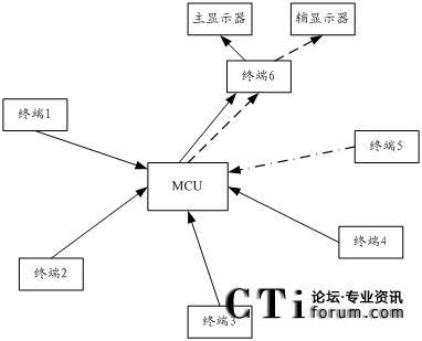 MCU將發(fā)言人所在的終端1的圖像通過(guò)主流通道發(fā)給終端6,將終端2、3、4的圖像解碼,并接成具有3個(gè)小畫(huà)面的單一畫(huà)面,編碼后通過(guò)輔流通道發(fā)給終端6,終端6將在主顯示器上看到終端1的圖像,在輔顯示器上看到終端2、3、4的圖像。