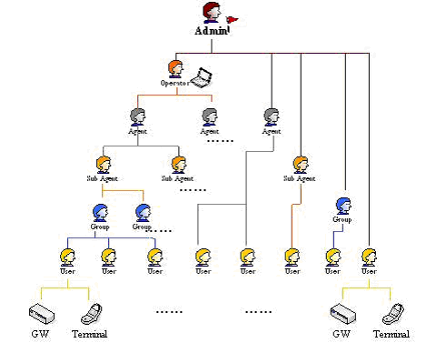 Admin為系統(tǒng)管理員,下有各個(gè)級(jí)別的賬號(hào)。除User外,其它均可視為各級(jí)代理。最低級(jí)別是User,只有在User下才能開啟終端設(shè)備賬號(hào)。