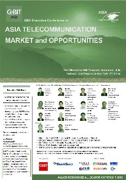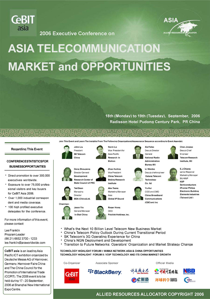 2006亞洲信息及通信技術展覽會,即亞洲CeBIT展將于今年9月17日至20日在上海新國際博覽中心召開。由中國國際貿(mào)促會電子信息行業(yè)分會與德國漢諾威展覽公司聯(lián)合主辦的這一展會,近300家國內(nèi)外廠商參展,將分為數(shù)字設備及系統(tǒng)、商務應用、通信三大展區(qū),多方位展現(xiàn)ICT行業(yè)的最新趨勢,并成為業(yè)內(nèi)廠商的專業(yè)貿(mào)易平臺。本次CeBIT展會期間(9月18、19日兩天),將在浦東證大麗笙酒店召開“2006亞洲通信及信息市場管理層論壇”。包括中國國家信息產(chǎn)業(yè)部、中國電信、韓國SK電訊、BDA中國等多家政府機關、運營商、制造商將參加本次論壇,并做重要發(fā)言。