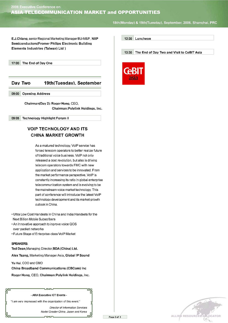Polylink總裁應邀擔任2006亞洲CeBIT“VoIP技術以及亞洲市場發(fā)展狀況”論壇主席