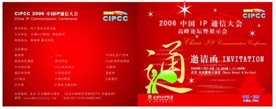 由全球VoIP聯(lián)盟主辦的2006年中國(guó)IP通信大會(huì)、高峰論壇暨展示會(huì),將于2006年11月7號(hào)和8號(hào)兩天在北京長(zhǎng)安戴斯大飯店舉行。