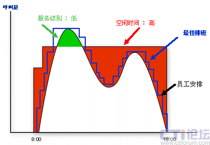 如果僅僅是工作量大,我想排班員還能夠忍受,更要命的是,排出的班表不能做到精確。要么人員太多,導致運營成本上升;要么人員不夠,無法達到預(yù)期的服務(wù)目標。以呼叫中心典型的雙峰曲線為例(如右圖),排班所追求的是人力安排和話務(wù)曲線的盡可能吻合(也就是圖中藍色的最佳排班線),達到在滿足服務(wù)水平的基礎(chǔ)上盡可能少的安排座席資源。而在手工排班中,由于大量的采用組排班,組中成員同時上下班、同時午餐,導致人力安排的靈活性降低,不能盡可能的去擬合話務(wù)曲線。此外,參考前面談到的影響人力安排的因素,手工排班中考慮了環(huán)境的影響,部分考慮了縮減,但座席技能因素考慮很少,基本認為所有人員的技能熟練度一致,不可預(yù)見性縮減也沒有考慮進去,導致最終會對服務(wù)水平造成負面影響。因此,手工排班是一種粗放型的排班方式,隨著運營要求的提高,表現(xiàn)出一定的不適應(yīng)性。