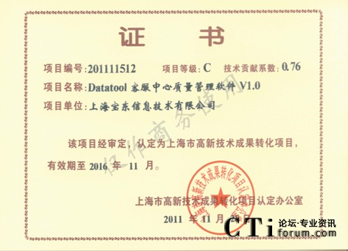 CTI論壇(ctiforum)12月7日消息(記者 張潔):2011年的最后一個(gè)月,寶東公司傳來(lái)又一好消息,公司的開(kāi)發(fā)團(tuán)隊(duì)自主開(kāi)發(fā)研制的針對(duì)呼叫中心客服的質(zhì)檢軟件“Datatool 客服中心質(zhì)量管理軟件(簡(jiǎn)稱DTQM)”經(jīng)過(guò)市高新技術(shù)轉(zhuǎn)化項(xiàng)目認(rèn)定辦公室層層審報(bào)審批,最終經(jīng)審定,被認(rèn)定為市高新技術(shù)成果轉(zhuǎn)化項(xiàng)目。