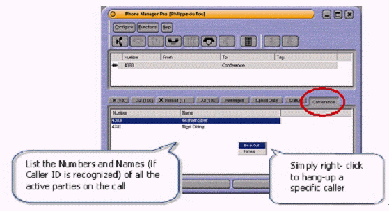 從IP Office Phone Manager Lite 和 Pro中也可控制會(huì)議- 對(duì)于 ad-hoc會(huì)議模式,參加會(huì)議的用戶需要撥打被叫用戶分機(jī)即可將被叫用戶加到會(huì)議中來(lái)。IP Office Phone Manager, 會(huì)議的發(fā)起者可以控制:每個(gè)與會(huì)者主被叫號(hào)碼(如果有姓名識(shí)別則會(huì)顯示姓名)會(huì)在Conference tab of Phone Manager的菜單中顯示.如果需要,會(huì)議發(fā)起者會(huì)選擇一個(gè)舉手的與會(huì)者。