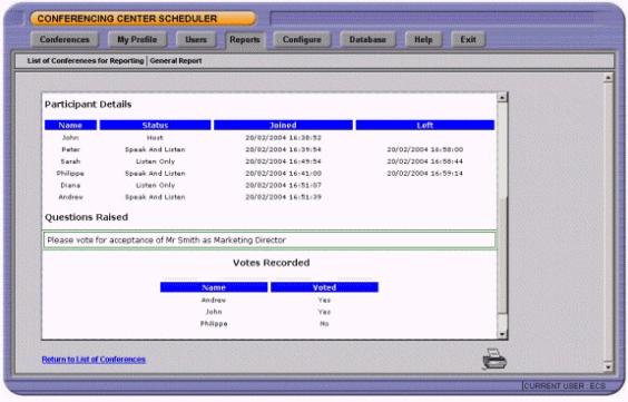 管理員可以生成會(huì)議使用率和每個(gè)會(huì)議的報(bào)告。消息內(nèi)容包括會(huì)議名稱,ID號(hào),會(huì)議起始日期,會(huì)議持續(xù)時(shí)間和與會(huì)人員的數(shù)目。每個(gè)會(huì)議報(bào)告可以列出與會(huì)人員的詳細(xì)列表和他們何時(shí)進(jìn)入/離開(kāi)會(huì)議。 另外,如果舉手投票在Power Conferencing Web Client使用的話, 在會(huì)議中針對(duì)每個(gè)問(wèn)題與會(huì)人員的投票結(jié)果可以顯示出來(lái)。