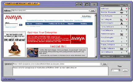 作為電話會(huì)議的補(bǔ)充,會(huì)議主席可以建立基于web的應(yīng)用。通過(guò)這樣的web接口,會(huì)議主席和與會(huì)人員不僅看到與會(huì)人員的狀態(tài),還可以設(shè)置聽(tīng)眾只聽(tīng),聽(tīng)和說(shuō),可以看到web界面的權(quán)限。web 客戶端只有投票的權(quán)限,而主席可以在會(huì)議中提出問(wèn)題,修改與會(huì)人員的狀態(tài)和某個(gè)與會(huì)人員私下交談。