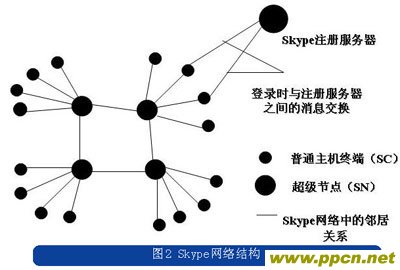 與常規(guī)的電信業(yè)務(wù)網(wǎng)絡(luò)不同的是,Skype的網(wǎng)絡(luò)中除了注冊(cè)服務(wù)器,沒有其他任何集中的服務(wù)器,只是將用戶節(jié)點(diǎn)分為普通節(jié)點(diǎn)和超級(jí)節(jié)點(diǎn)。Skype的系統(tǒng)連接結(jié)構(gòu)如圖2所示。