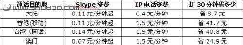3G手機(jī)用Skype和固定電話通話的資費(fèi)與傳統(tǒng)IP電話相比如何呢?見下表: