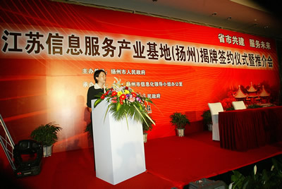 “腰纏十萬(wàn)貫,騎鶴下?lián)P州”——在“煙花三月”最美的季節(jié),在“長(zhǎng)江三角洲經(jīng)濟(jì)帶”最具活力的地區(qū),在榮獲“聯(lián)合國(guó)人居獎(jiǎng)”的揚(yáng)州,4月21、22日“江蘇信息服務(wù)產(chǎn)業(yè)基地(揚(yáng)州)揭牌簽約推介暨揚(yáng)州呼叫產(chǎn)業(yè)基地建設(shè)運(yùn)營(yíng)管理論壇”隆重舉行,揚(yáng)州市市長(zhǎng)、江蘇省信息產(chǎn)業(yè)廳廳長(zhǎng)、揚(yáng)州人大等四套班子以及來自北京、上海及江蘇省內(nèi)的各信息產(chǎn)業(yè)的相關(guān)企業(yè)高管及業(yè)內(nèi)知名專家,帶著投資,帶著知識(shí),帶著對(duì)信息揚(yáng)州規(guī)劃的建議,齊聚揚(yáng)州,共商大計(jì)。