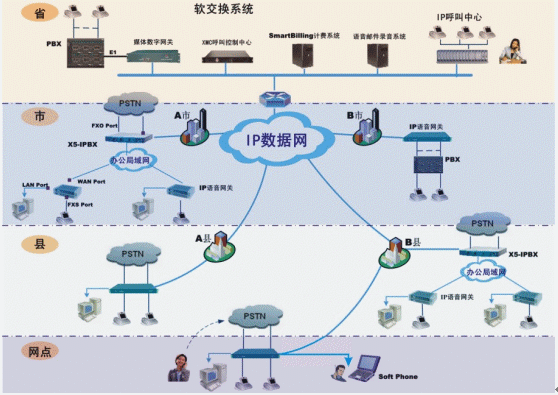 在各級(jí)辦公機(jī)構(gòu)根據(jù)原有用戶數(shù)量,可以配置IP電話綜合接入設(shè)備或IP-PBX,連接當(dāng)?shù)卦械霓k公電話環(huán)境(程控電話交換機(jī)、直線市話、電信虛擬網(wǎng)等)。實(shí)現(xiàn)機(jī)構(gòu)內(nèi)部辦公電話/傳真通過IP數(shù)據(jù)網(wǎng)通信。同時(shí)機(jī)構(gòu)以外的長途電話/傳真也可以利用IP電話網(wǎng)傳輸,而不產(chǎn)生任何長途通信費(fèi)用。