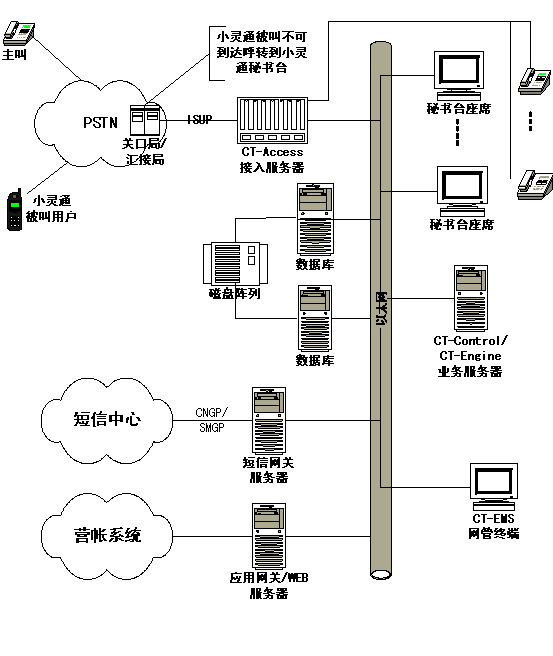 如上圖所示,小靈通秘書臺網(wǎng)絡(luò)拓?fù)鋱D,上圖中紅色虛線的左邊為運(yùn)營商部分,紅線是接口部分, 紅色虛線的右邊是增加的小靈通秘書臺設(shè)備和工程實施部分。首先需要在小靈通網(wǎng)絡(luò)的關(guān)口局或者匯接局設(shè)置被叫不可到達(dá)(關(guān)機(jī)、忙、不在服務(wù)區(qū))呼叫前轉(zhuǎn),通過ISUP協(xié)議呼叫到小靈通秘書臺的CT-Access接入服務(wù)器,提取主叫號碼、被叫號碼、原被叫號碼,同時給主叫播放語音,"您撥的用戶無法接通,您可以選擇失話復(fù)得業(yè)務(wù),本業(yè)務(wù)每條短信收費(fèi)0.1元,漏話提示請按1號鍵,短信回叫請按2號鍵,轉(zhuǎn)人工請按9號鍵"。然后根據(jù)主叫的響應(yīng)選擇提供服務(wù)(業(yè)務(wù)流程見第3章)。小靈通秘書臺的業(yè)務(wù)部分由CT-Control/CT-Engine業(yè)務(wù)服務(wù)器和數(shù)據(jù)庫服務(wù)器組成,另外包括人工臺和短信網(wǎng)關(guān),短信網(wǎng)關(guān)通過CNGP(網(wǎng)通)、SMGP(電信)和短信中心網(wǎng)關(guān)接口,實現(xiàn)短信發(fā)送功能。業(yè)務(wù)網(wǎng)關(guān)和WEB服務(wù)器為可選部分,根據(jù)業(yè)務(wù)需要選配。