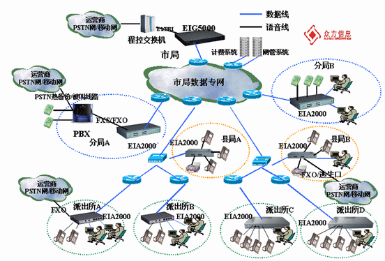 公安系統(tǒng)作為一家話務(wù)量較大的國家職能部門,平時各個分局,各個派出所之間及上下級之間的電話、傳真等交流非常多,每月支付的話費數(shù)目相當可觀,公安部門急需找到一種價格更便宜、服務(wù)更周到,同時使用便捷的通話解決方案,以降低辦公費用,提高工作效率。采用了深圳眾方信息的VoIP解決方案,能使得公安部門整體話費節(jié)省了至少50%以上,而且能實現(xiàn)多種業(yè)務(wù)的綜合處理,包括語音、數(shù)據(jù)、視頻、圖像等。
