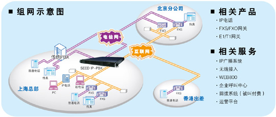 SEED系統(tǒng)IP-PBX可連接互聯(lián)網(wǎng)與電信網(wǎng),可與CRM、Billing、Soft Switch等配合使用。