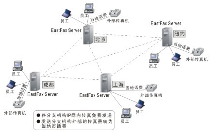 EastFax在國內(nèi)首次應(yīng)用中央服務(wù)器的方式管理整個集團的傳真。改變以往各個服務(wù)器之間一一相連、繁瑣相加的方式,每個服務(wù)器只需與中央服務(wù)器相連,即加入整個集團傳真網(wǎng)絡(luò)。