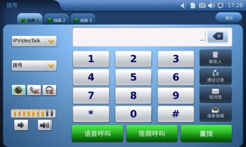 7寸大屏搭配寬大的數(shù)字虛擬鍵盤,讓你的撥號(hào)準(zhǔn)確無誤。同時(shí)界面的所顯示的通話功能諸如查找聯(lián)系人、查找通話記錄、發(fā)送短消息或者快速進(jìn)入語音信箱等功能也清晰明了?梢园l(fā)現(xiàn)的是,用戶在輸完號(hào)碼之后可自主選擇采用語音呼叫還是視頻呼叫。另外,同潮流網(wǎng)絡(luò)之前的一款視頻電話GXV3140一樣的是,GXV3175也在出廠自帶了一個(gè)IPVideoTalk賬號(hào)。該賬號(hào)是出廠時(shí)就已配置好的,每一臺(tái)電話配備一個(gè)號(hào)碼并顯示在桌面上。也就是說,用戶在拿到GXV3175并聯(lián)網(wǎng)之后即可使用該賬號(hào)撥打免費(fèi)的視頻電話了。這可是很多廠商所沒有的特殊功能。下面我們就使用隨機(jī)附送的IPVideoTalk賬號(hào)來撥打視頻電話。