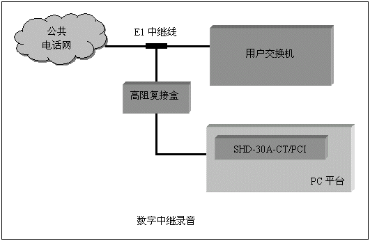 通道數(shù)較多的大中型應(yīng)用系統(tǒng),一般采用數(shù)字中繼線(E1)接入公共電話網(wǎng),三匯公司的SHD系列數(shù)字中繼卡可以提供相應(yīng)的解決方案。SHD系列數(shù)字中繼在一塊卡上集成了E1線接口,語音資源,信令處理等所必須的全部功能,其接入信令處理模塊可處理中國1號信令(SS1),7號信令(SS7),ISDN PRI協(xié)議(DSS1),單塊卡最多可支持4個E1接入。通過CT-BUS(或ST-BUS)總線,還可以在數(shù)字中繼線上實現(xiàn)傳真功能。典型應(yīng)用結(jié)構(gòu)如下圖: