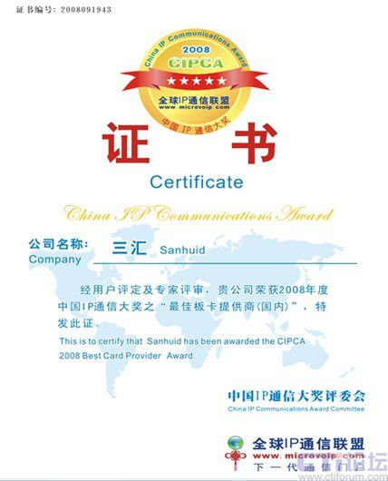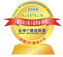 9月19日,在上海盛大舉行的CIPCC中國IP通信大會上,杭州三匯摘取了CIPCA 2008年國內(nèi)最佳語音板卡提供商大獎,體現(xiàn)了杭州三匯在國內(nèi)語音卡領域的絕對領導和優(yōu)勢地位。