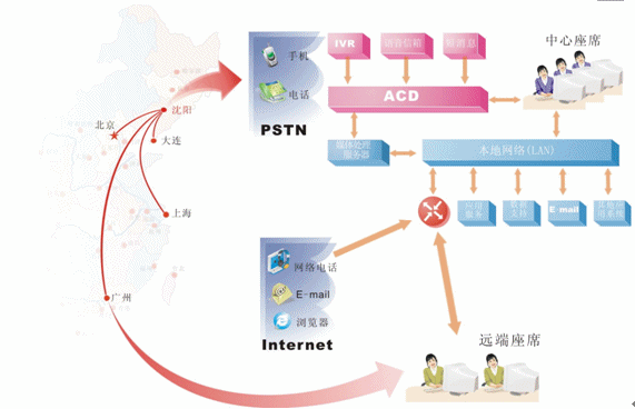 對(duì)于地區(qū)分布廣泛,而又要集中管理的企業(yè),可在各個(gè)局部地區(qū)設(shè)置遠(yuǎn)端座席,并通過網(wǎng)絡(luò)方便的接入中心系統(tǒng)。我們?yōu)檫h(yuǎn)端座席提供與中心座席完全相同的操作,遠(yuǎn)端座席可以根據(jù)各個(gè)地區(qū)的特定情況有針對(duì)性的處理各個(gè)局部地區(qū)的業(yè)務(wù),為中心分流壓力,同時(shí)中心系統(tǒng)也可以完全掌握遠(yuǎn)端座席的情況。我們可以非常明確的一點(diǎn)是:采用分布式座席的技術(shù),使得遠(yuǎn)端座席與中心座席除了地域上的差異,其它部分完全相同。可以說只要網(wǎng)絡(luò)無(wú)極限,座席分布就是無(wú)極限的。