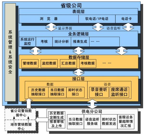 客服監(jiān)管系統(tǒng)中省級公司部分通過接口層與供電公司的客戶服務(wù)系統(tǒng)交換數(shù)據(jù)。通過業(yè)務(wù)邏輯層對接收到的數(shù)據(jù)進行處理、展現(xiàn),并且處理要發(fā)送的數(shù)據(jù),在此實現(xiàn)所有的業(yè)務(wù)邏輯。供電公司部分負(fù)責(zé)提供歷史的和當(dāng)天的各種業(yè)務(wù)數(shù)據(jù)。整個結(jié)構(gòu)中也考慮到了數(shù)據(jù)中心,數(shù)據(jù)中心建立后將定期導(dǎo)入各供電公司客戶服務(wù)系統(tǒng)的歷史數(shù)據(jù),并提供給省級公司包括監(jiān)管系統(tǒng)在內(nèi)的各種應(yīng)用系統(tǒng)使用。