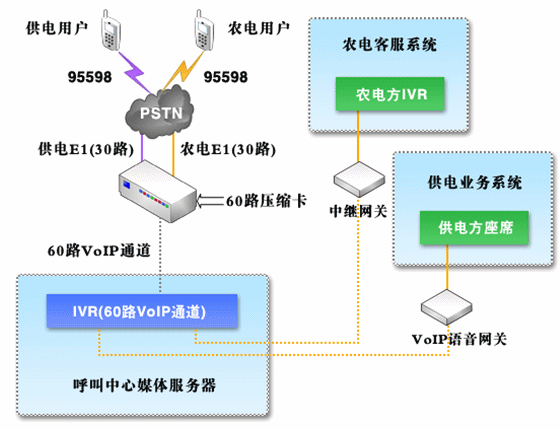 對(duì)于呼叫中心系統(tǒng),由95598特別號(hào)碼統(tǒng)一接入,并且在供電呼叫中心系統(tǒng)與農(nóng)電呼叫中心系統(tǒng)之間采用中繼方式(模擬中繼或者數(shù)字中繼,視農(nóng)電方實(shí)際情況而定)進(jìn)行話路連接,同時(shí)保證系統(tǒng)接入容量及其他資源能夠滿足統(tǒng)一的要求;在自動(dòng)語音菜單中,分別設(shè)立供、農(nóng)電用戶層,用戶可以自行區(qū)分、選擇,對(duì)于農(nóng)電用戶在確定用戶類型之后,通過中繼將話路轉(zhuǎn)接到農(nóng)電方呼叫中心系統(tǒng)。